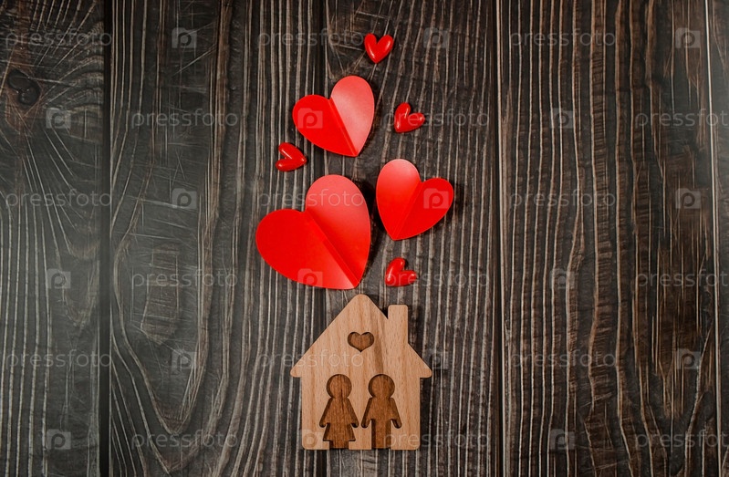 Домашний символ с красными сердцами на деревянном фоне с копировальным пространством. Дом, милый дом