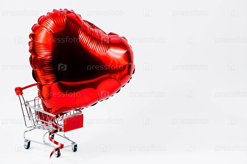 Корзина с едой, подарочная коробка и воздушный шар в форме сердца. Интернет-магазины. Зимние праздничные распродажи, Сезонные распродажи, Черная пятница, 14 февраля, День святого Валентина. Скидки и покупки на месте