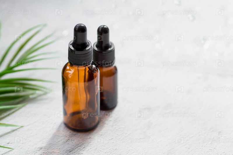 Ароматерапия. Стеклянная бутылка с пипеткой для масла, лосьона и пальмовых листьев на бетонном фоне лежала сверху. Натуральная органическая экокосметика. Макет брендинга салона красоты