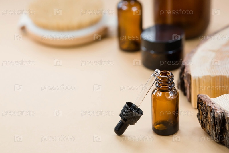 На деревянной подставке стояла стеклянная бутылка с пипеткой для масла и массажная щетка. Натуральная органическая экокосметика. Макет брендинга салона красоты. Ароматерапия