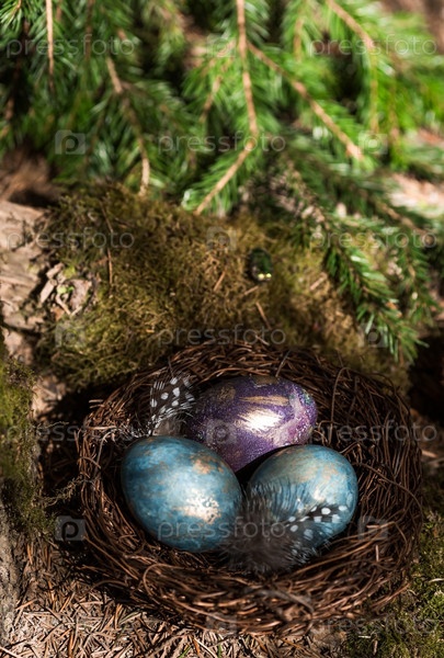 С Пасхой 2023. Открытка с копией места для текста. Фиолетовые, синие и золотые яйца в гнезде на фоне естественного леса. Вид сверху