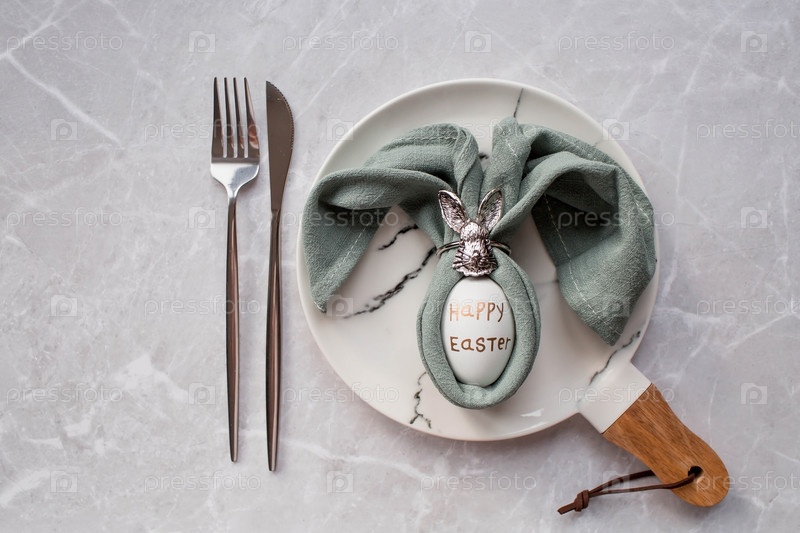 Баннер. Сервировка стола. Модная мраморная тарелка с кроликом и яйцом в салфетке на сером фоне. Вид сверху. Концепция счастливого пасхального праздника для кафе и ресторанов