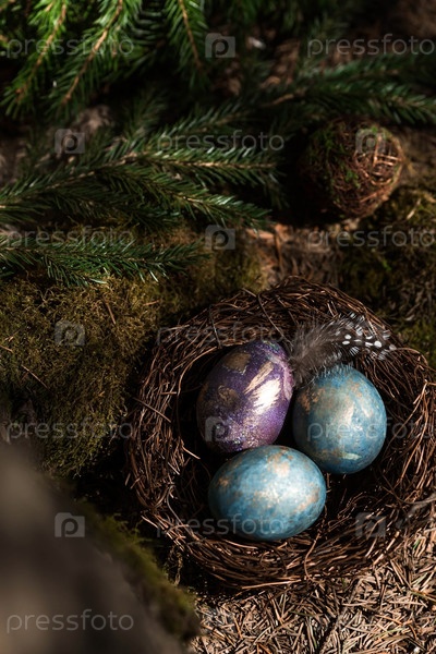С Пасхой 2023. Открытка с копией места для текста. Фиолетовые, синие и золотые яйца в гнезде на фоне естественного леса. Вид сверху