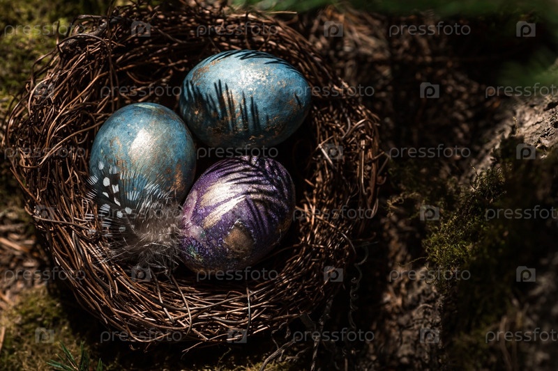 С Пасхой 2023. Открытка с копией места для текста. Фиолетовые, синие и золотые яйца в гнезде на фоне естественного леса. Вид сверху