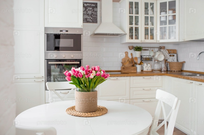 Букет тюльпанов на белом столе. На заднем плане интерьер белой кухни в скандинавском стиле. Концепция домашнего уюта. Концепция Международного женского дня 8 марта