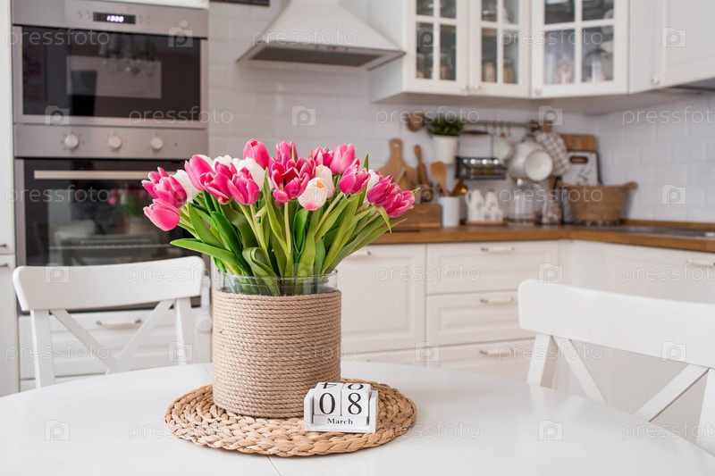 Букет тюльпанов на белом столе. На заднем плане интерьер белой кухни в скандинавском стиле. Концепция домашнего уюта. Концепция Международного женского дня 8 марта