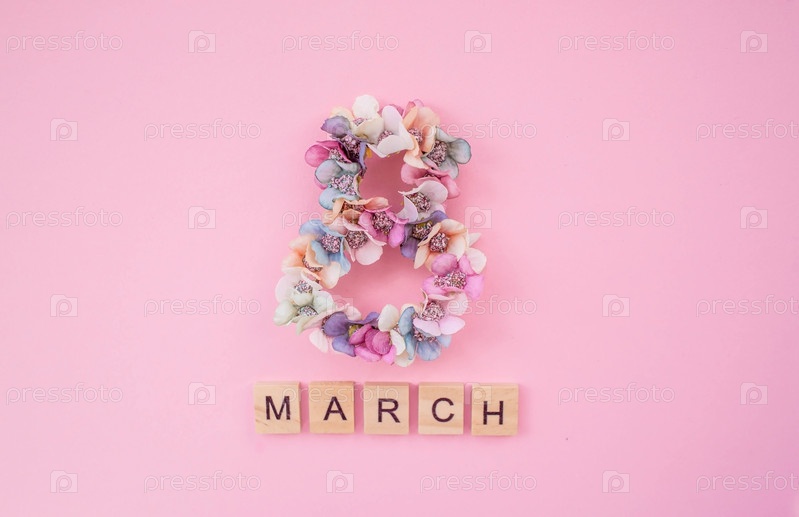 Международный женский день. Цветы в форме восьмерки на розовом фоне. Баннер, флаер, красивая открытка к 8 марта