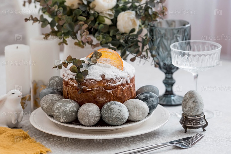 Весенняя сервировка стола. Тарелка с хлопковой салфеткой с зайчиком, тортом и пасхальными яйцами. Столовое серебро, пасхальные кролики и ваза с цветами на льняной скатерти. Концепция светлого праздника Пасхи