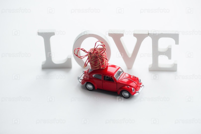 Москва, Россия - январь 2020 г.: Доставка красного ретро игрушечного автомобиля