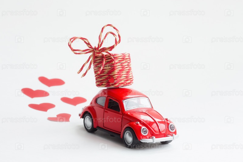Москва, Россия - январь 2020 г.: Доставка красного ретро игрушечного автомобиля