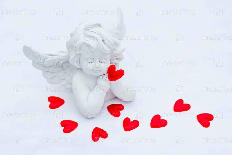 Милый ангел, сердца на фоне белого мрамора. Тема любви. День Святого Валентина. Открытка к празднику