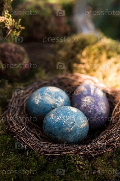 С Пасхой 2023. Открытка с копией места для текста. Фиолетовые, синие и золотые яйца в гнезде на фоне естественного леса. Вид сверху
