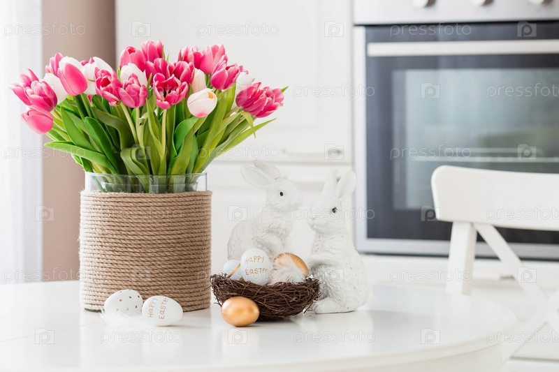 Букет тюльпанов, пасхальные кролики и яйца с золотым узором на столе. На заднем плане белая кухня в скандинавском стиле. Красивая открытка. Минимальная концепция