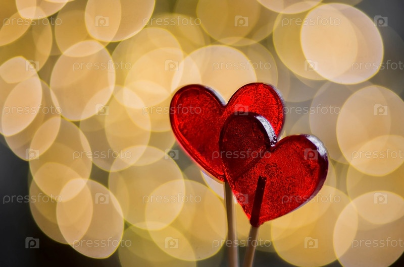 Два леденца в форме красных сердец. Конфеты на палочке на фоне красивого боке. Концепция любви и День святого Валентина
