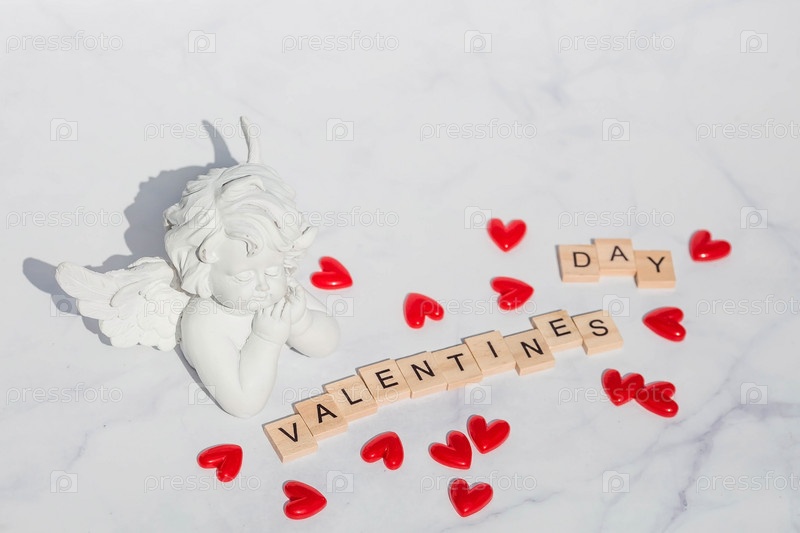 Слово «День святого Валентина» и милый ангел на белом мраморном фоне. Любовь на деревянных кубиках. Тема любви. День Святого Валентина. Деревянные блоки со словом любовь. Положительные эмоции