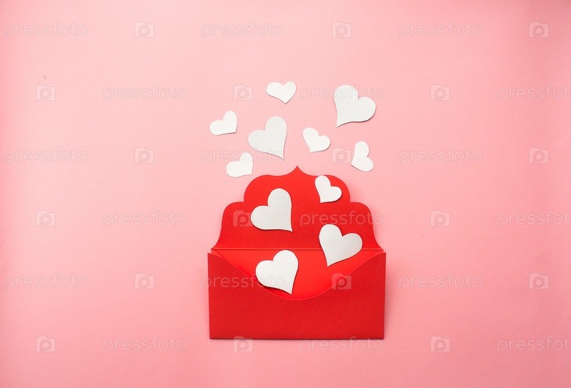 Красный конверт и белые сердца на розовом фоне. Концепция любви. Концепция Дня святого Валентина. Концепция дня матери. Плоская планировка