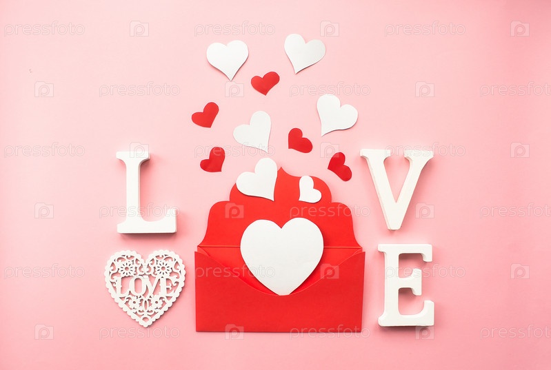 Красный конверт и белые сердца на розовом фоне. Концепция любви. Концепция Дня святого Валентина. Концепция дня матери. Плоская планировка