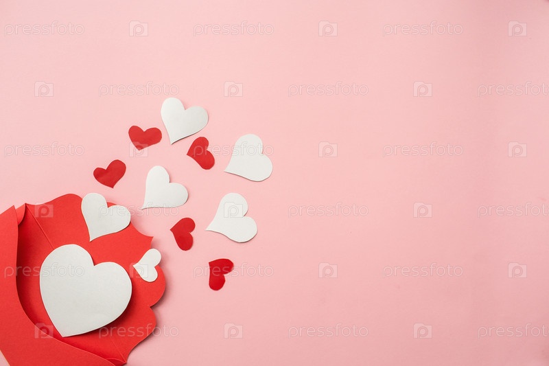 Красный конверт и белые сердца на розовом фоне. Концепция любви. Концепция Дня святого Валентина. Концепция дня матери. Плоская планировка