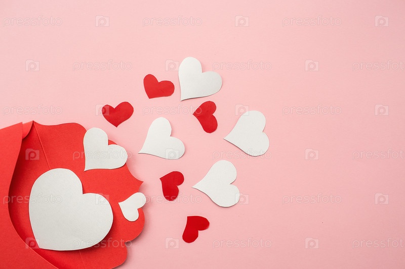 Красный конверт и белые сердца на розовом фоне. Концепция любви. Концепция Дня святого Валентина. Концепция дня матери. Плоская планировка