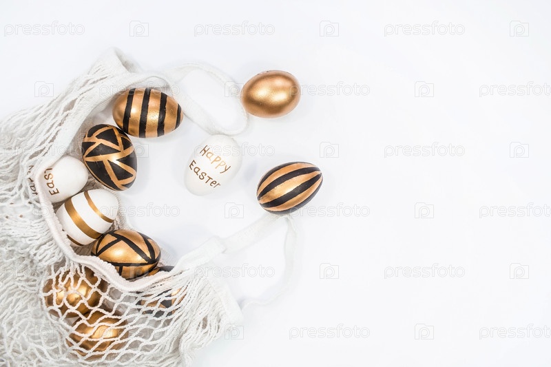 Золотые, черные, белые пасхальные яйца в авоське на белом фоне. Геометрия. Минимальная концепция. Вид сверху. Карточка с копией места для текста