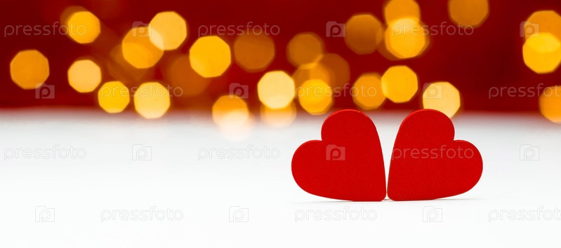 Баннер. Фон для Дня святого Валентина. два сердца с праздничными огнями боке на заднем плане. макет пригласительного билета на вечеринку в честь дня влюбленных, пространство для копирования