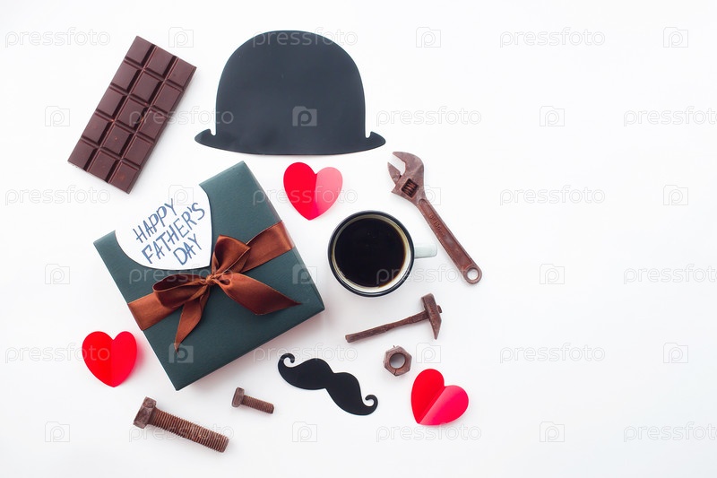 Концепция праздника Дня отца. Флэтлей. Шляпа, кофейная кружка, подарок, конфеты в виде старых инструментов и забавные черные усы на изолированном белом фоне. Скопируйте место для надписей