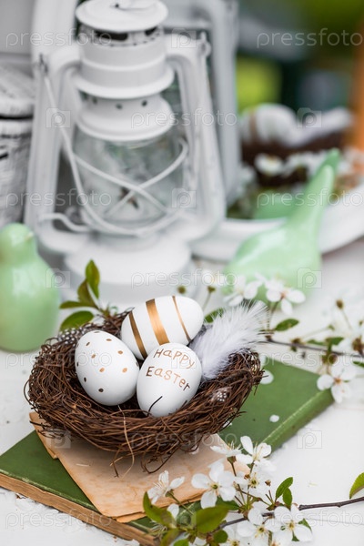 Баннер. Бело-зеленые яйца, вишневые цветы в гнезде, старая книга и фарфоровые птицы на белом деревянном столе. Праздничная открытка на Пасху 2022 года в винтажном стиле