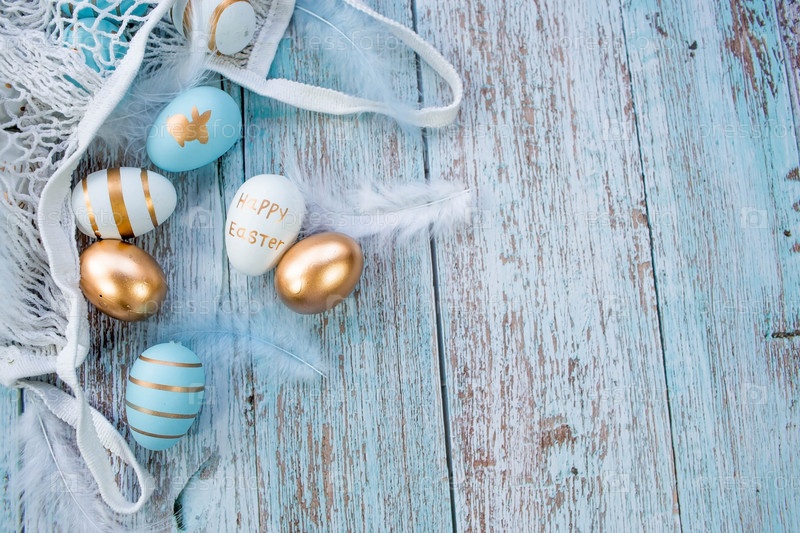 Золотые, черные, белые, синие яйца в авоське на синем деревянном фоне. Геометрия. Минимальная концепция. Вид сверху. Пасхальная открытка с копией места для текста
