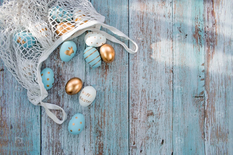 Золотые, черные, белые, синие яйца в авоське на синем деревянном фоне. Геометрия. Минимальная концепция. Вид сверху. Пасхальная открытка с копией места для текста