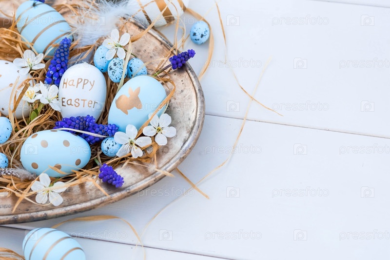 Баннер. Пасхальная открытка 2022 года. Праздничные белые и голубые вишни на железном подносе на белом деревянном фоне. Минимальная концепция