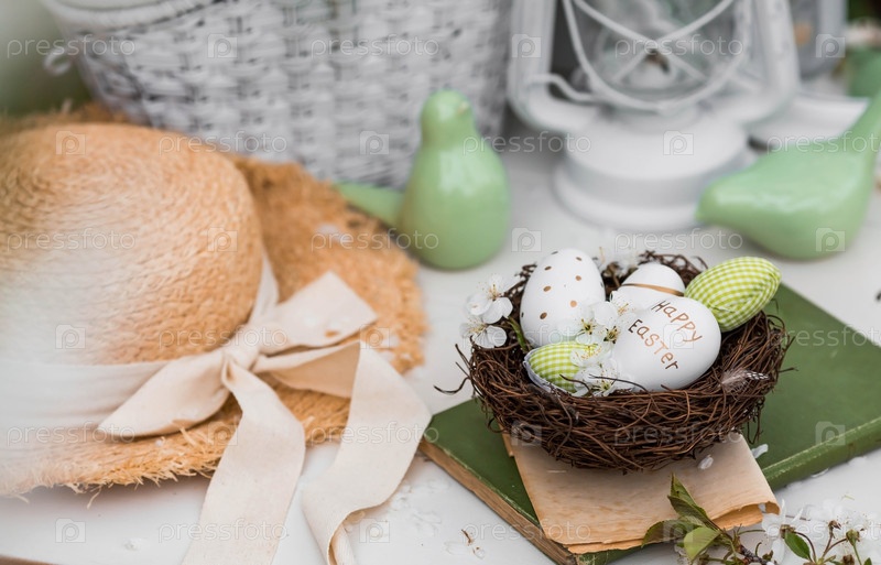 Баннер. Бело-зеленые яйца, вишневые цветы в гнезде, старая книга и фарфоровые птицы на белом деревянном столе. Праздничная открытка на Пасху 2023 года в винтажном стиле
