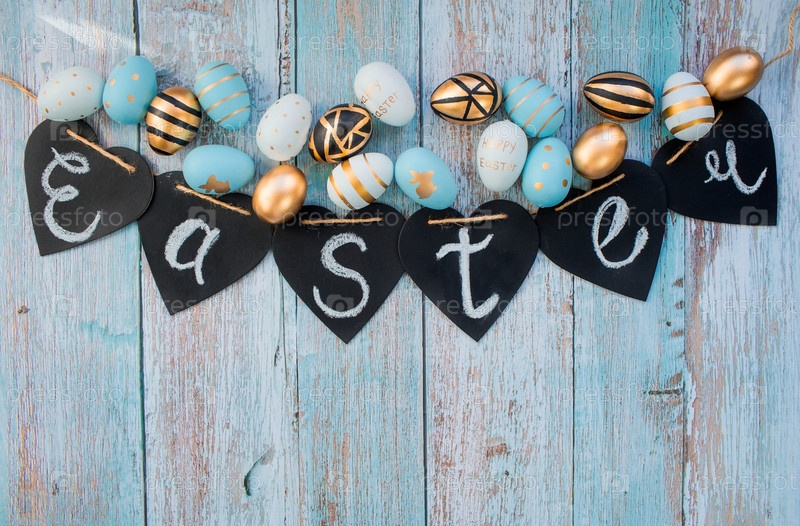 Золотые, черные, белые, синие яйца в авоське на синем деревянном фоне. Геометрия. Минимальная концепция. Вид сверху. Пасхальная открытка с копией места для текста