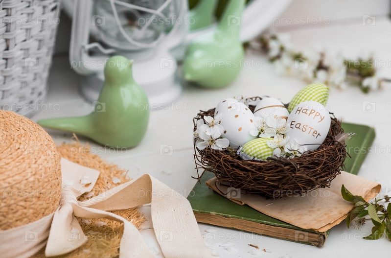 Баннер. Бело-зеленые яйца, вишневые цветы в гнезде, старая книга и фарфоровые птицы на белом деревянном столе. Праздничная открытка на Пасху 2023 года в винтажном стиле
