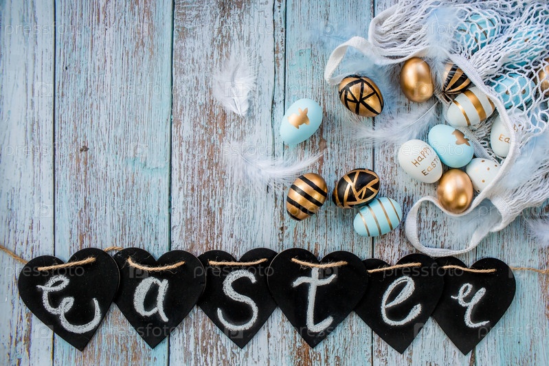 Золотые, черные, белые, синие яйца в авоське на синем деревянном фоне. Геометрия. Минимальная концепция. Вид сверху. Пасхальная открытка с копией места для текста