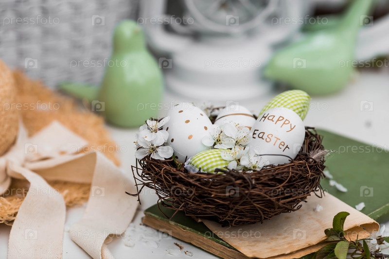 Баннер. Бело-зеленые яйца, вишневые цветы в гнезде, старая книга и фарфоровые птицы на белом деревянном столе. Праздничная открытка на Пасху 2023 года в винтажном стиле