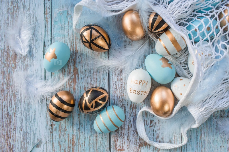 Золотые, черные, белые, синие яйца в авоське на синем деревянном фоне. Геометрия. Минимальная концепция. Вид сверху. Пасхальная открытка с копией места для текста