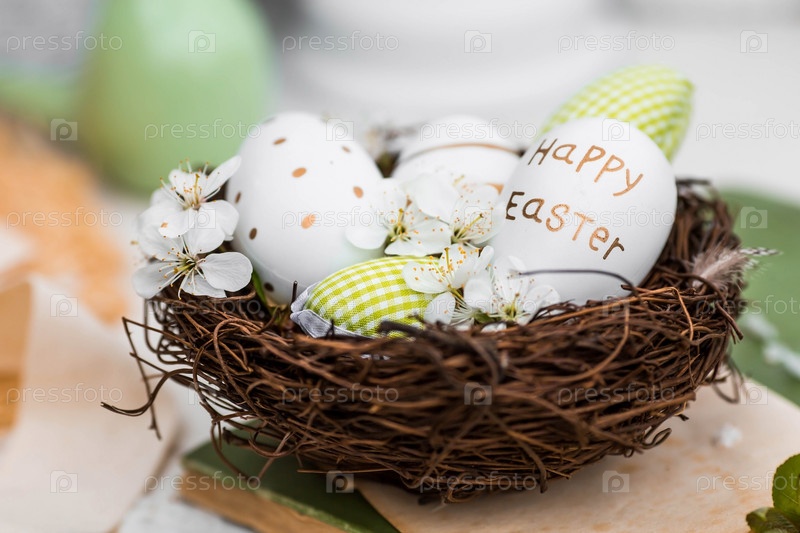 Баннер. Бело-зеленые яйца, вишневые цветы в гнезде, старая книга и фарфоровые птицы на белом деревянном столе. Праздничная открытка на Пасху 2023 года в винтажном стиле