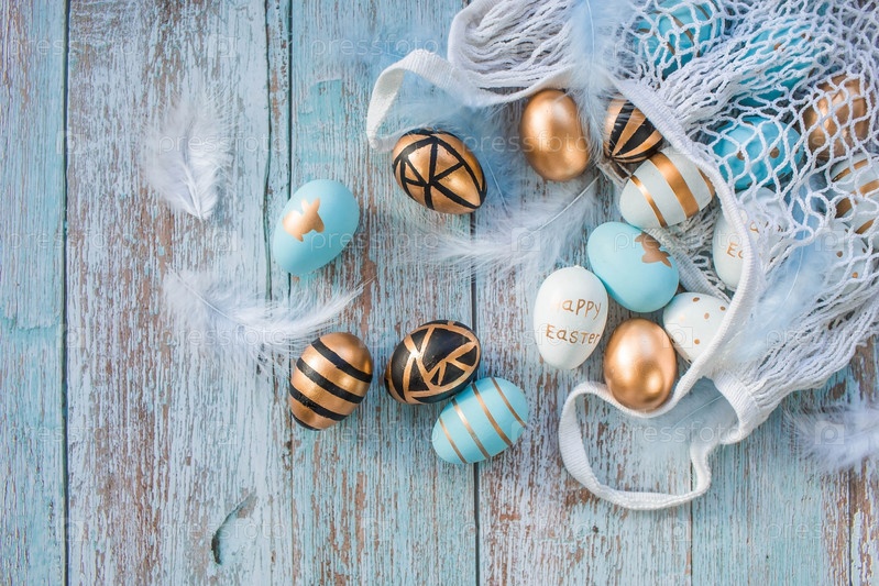 Золотые, черные, белые, синие яйца в авоське на синем деревянном фоне. Геометрия. Минимальная концепция. Вид сверху. Пасхальная открытка с копией места для текста