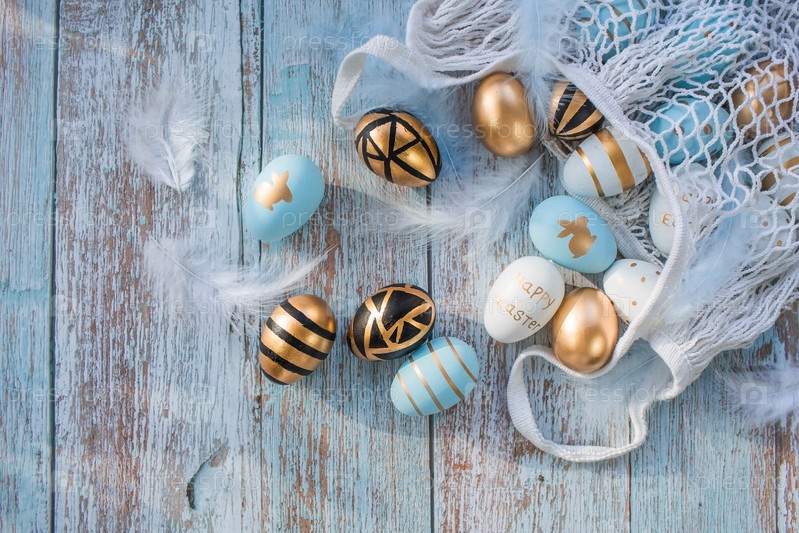 Золотые, черные, белые, синие яйца в авоське на синем деревянном фоне. Геометрия. Минимальная концепция. Вид сверху. Пасхальная открытка с копией места для текста
