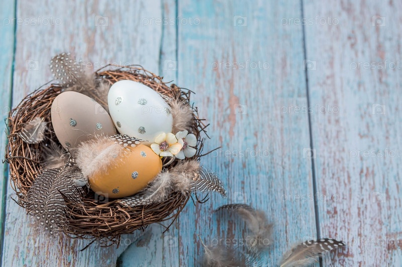 Пасхальные яйца, перья в гнезде на синем деревянном фоне. Минимальная концепция. Вид сверху. Карточка с копией места для текста