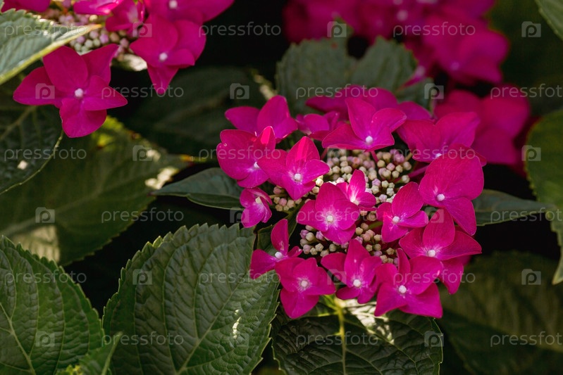 Красивые здоровые гортензии, цветущие красным цветом
