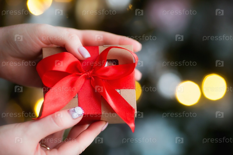 Крупный план женских рук, держащих небольшой подарок, завернутый в красную ленту. Небольшой подарок в руках женщины в помещении. Малая глубина резкости с акцентом на маленьком поле