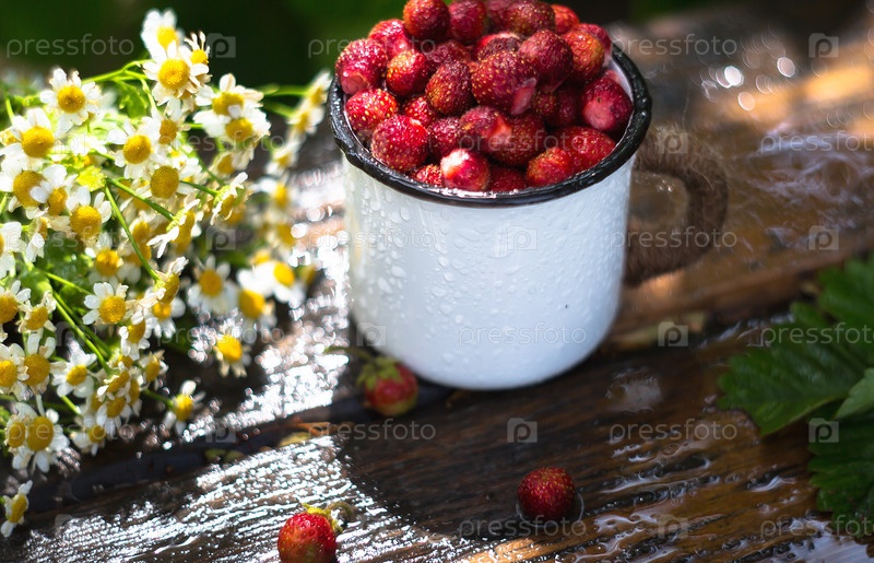 Кружка вкусной, спелой, красной клубники в каплях воды на деревянном столе