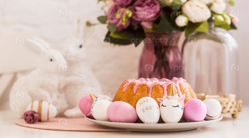 Баннер. Минимальная концепция. Кулич, кролики и яйца в виде единорога и с золотым узором на белом столе. Скопируйте место для текста