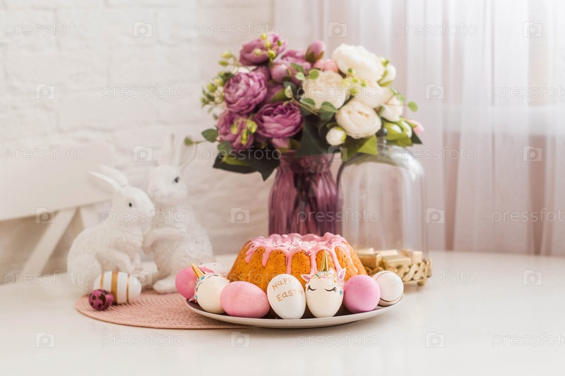 Баннер. Минимальная концепция. Кулич, кролики и яйца в виде единорога и с золотым узором на белом столе. Скопируйте место для текста