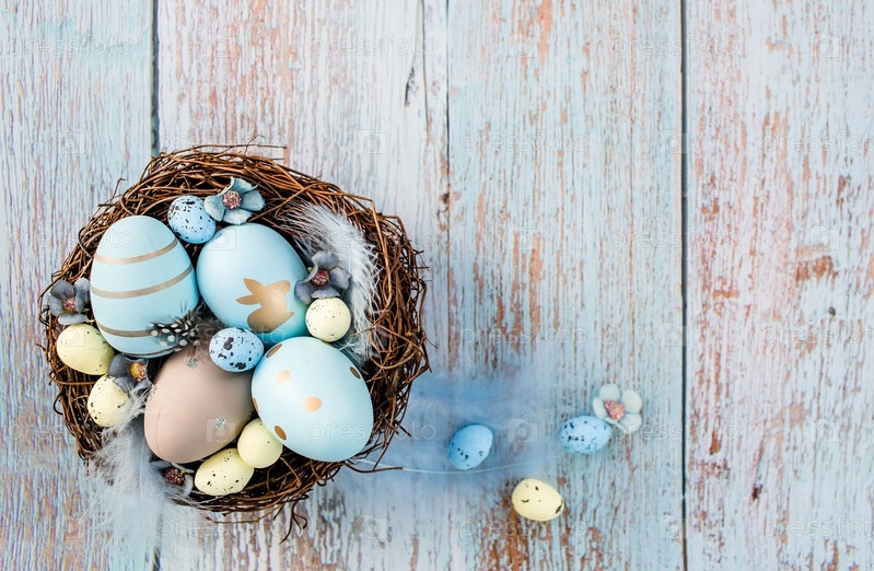 Пасхальные яйца, перья в гнезде на синем деревянном фоне. Минимальная концепция. Вид сверху. Карточка с копией места для текста