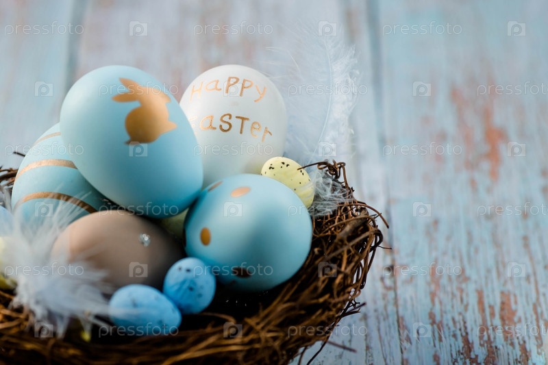 Баннер. Пасхальные яйца, перья в гнезде на синем деревянном фоне. Минимальная концепция. Вид сверху. Карточка с копией места для текста