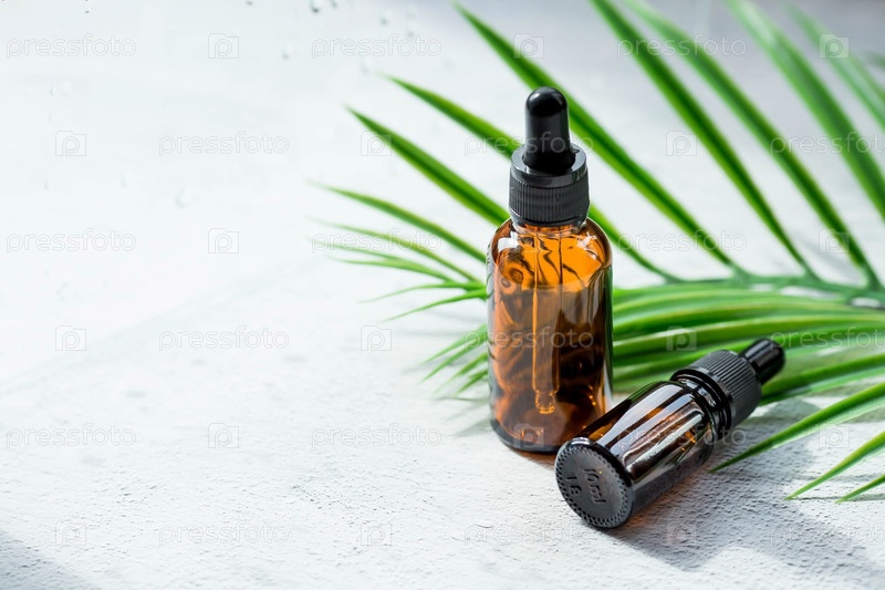 Ароматерапия. Стеклянная бутылка с пипеткой для масла, лосьона и пальмовых листьев на бетонном фоне лежала сверху. Натуральная органическая экокосметика. Макет брендинга салона красоты