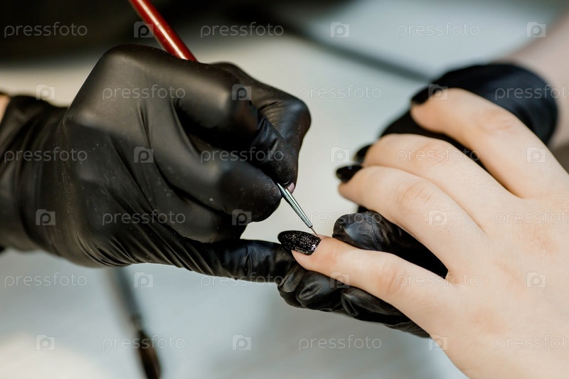 Мастер маникюра в салоне красоты выполняет процедуру окрашивания ногтей клиента. Женская мода и красота. Самообслуживание
