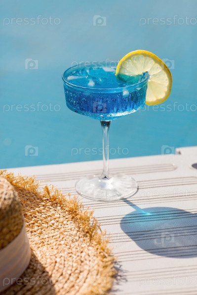 Стакан вкусного голубого коктейля Голубая лагуна и желтые лимоны на фоне бассейна. Алкогольный коктейль из сочных фруктов блю с ликером кюрасао, кубиками льда и долькой лимона